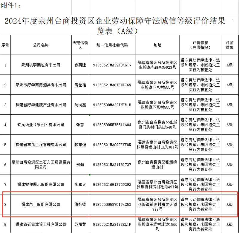 近日,根據(jù)《泉州臺(tái)商投資區(qū)管理委員會(huì)民生保障局關(guān)于開展2024年度企業(yè)勞動(dòng)保障守法誠信等級(jí)評(píng)價(jià)的通知》(泉臺(tái)管民生文〔2025〕11號(hào))文件規(guī)定,經(jīng)嚴(yán)格審核,福建泉工股份有限公司(以下簡(jiǎn)稱“泉工股份”)被評(píng)定為“2024年度企業(yè)勞動(dòng)保障守法誠信等級(jí)A級(jí)企業(yè)”,成為全區(qū)25家獲此殊榮的企業(yè)之一。